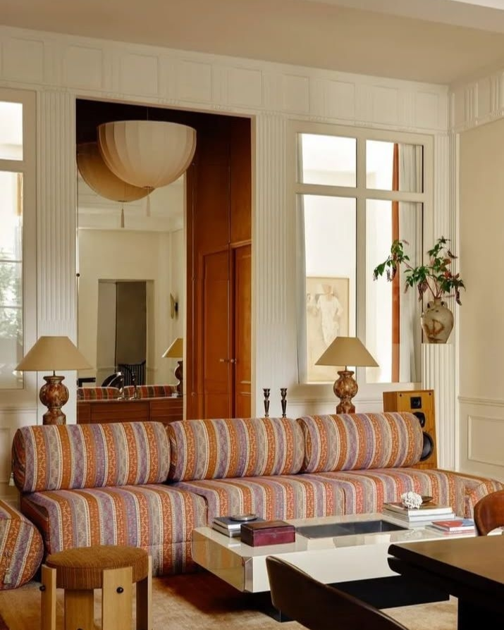 An interior that is rooted in the ethereal, elegant bones similar to French apartments. It is warmed up through mid-toned woods, marbles, and potteries. While sporting many traditional lines in the lamps, candlesticks, and moulding, it is brought back into the modern with touches of silver and hard right angles present in the furniture. A vintage striped pattern in orange and lavender really sets the tone of a modern take on midcentury and French design.