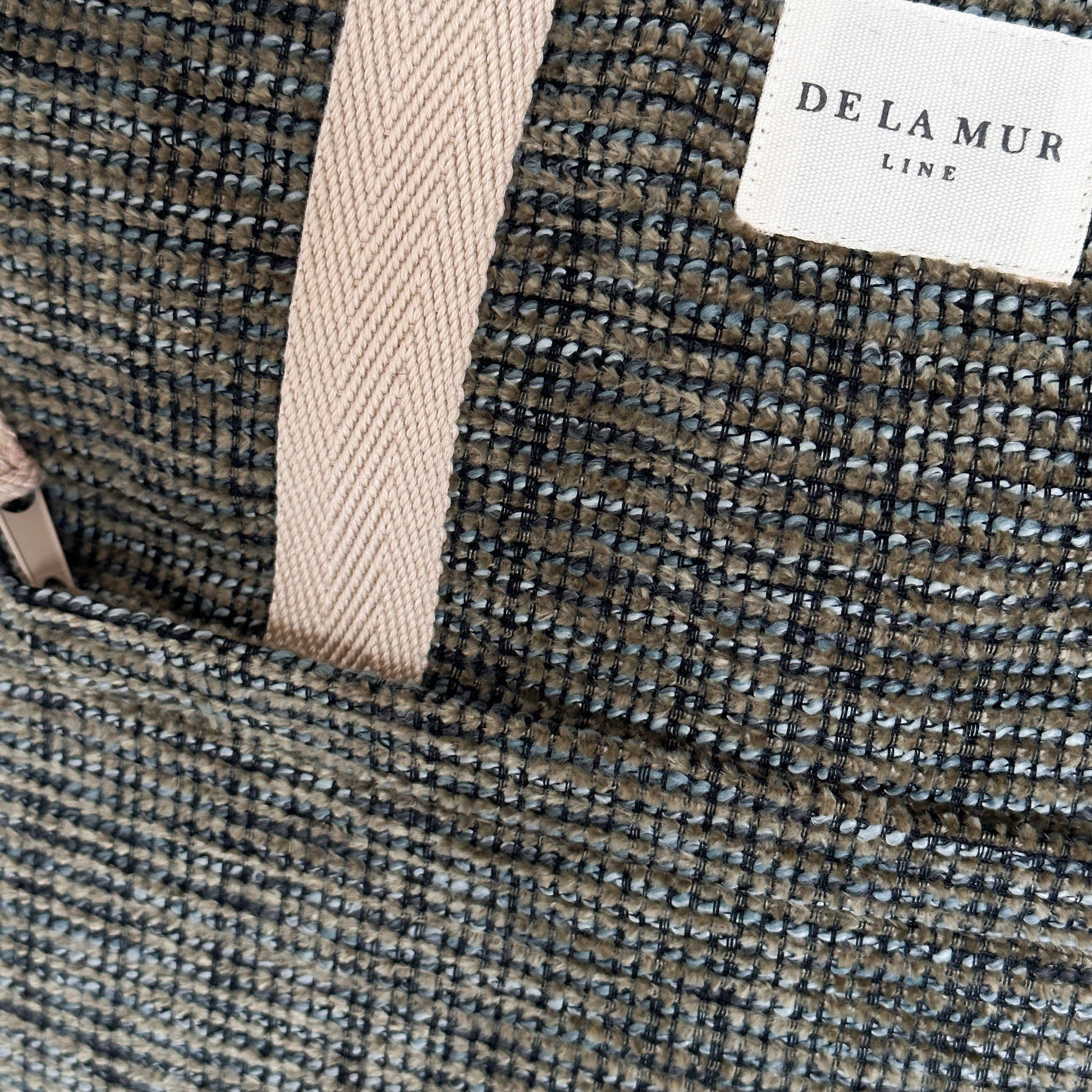 Convertible backpack and shoulder bag with adjustable straps and two top handles to carry it over the shoulder. Made from thick khaki green upholstery fabric. Interior zip pocket. Khaki cotton herringbone tape handles with a broken stripe detail on the sides. For proper care, wash in cold water and do not tumble dry.