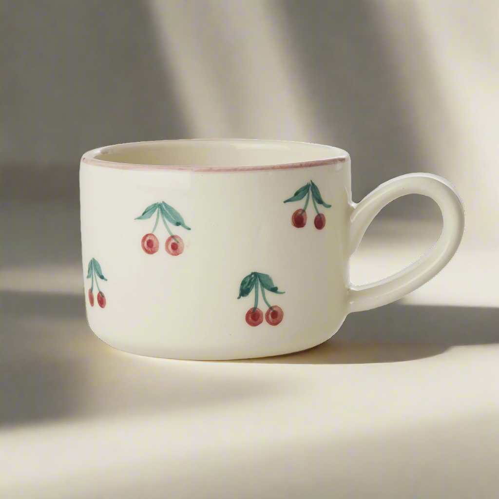 Ceramic Cappuccino Cup with Hand Painted Cherries - 6.7 oz