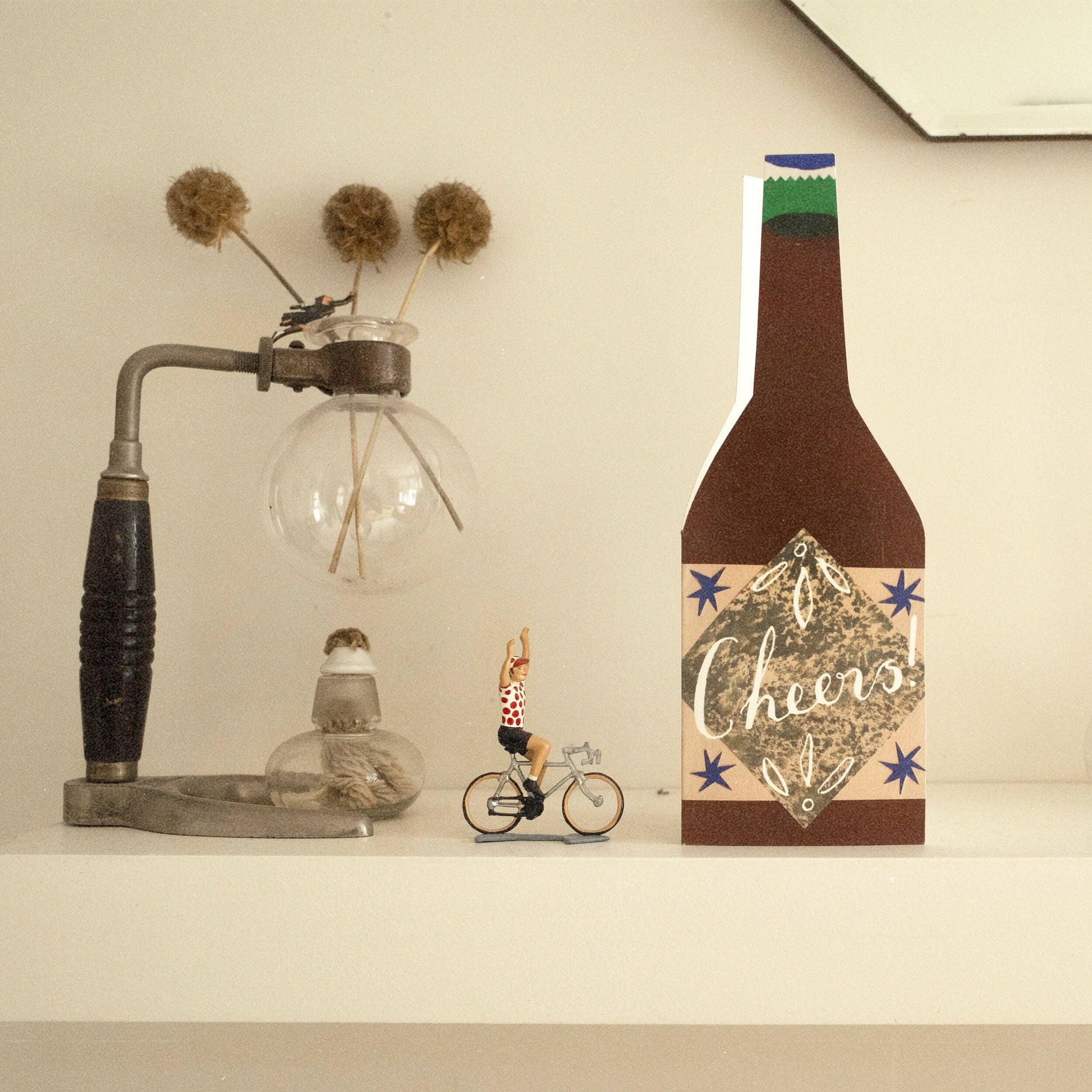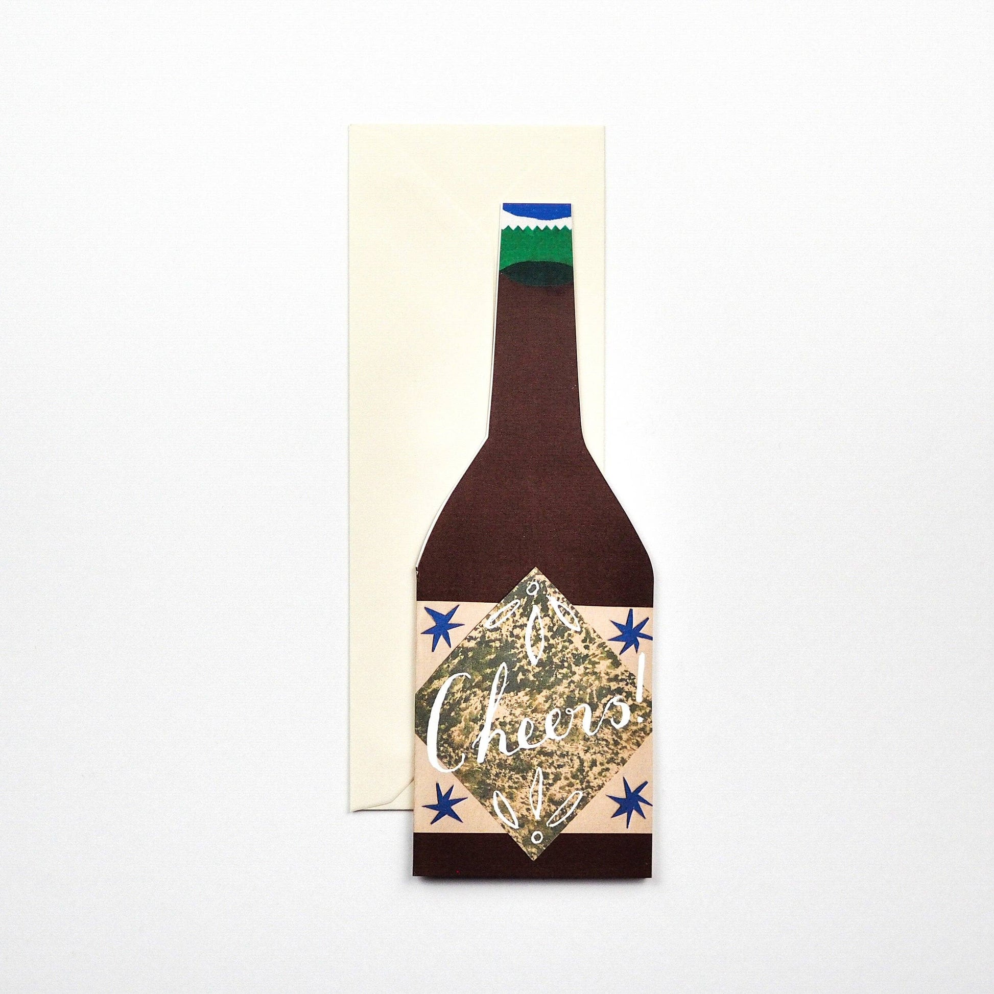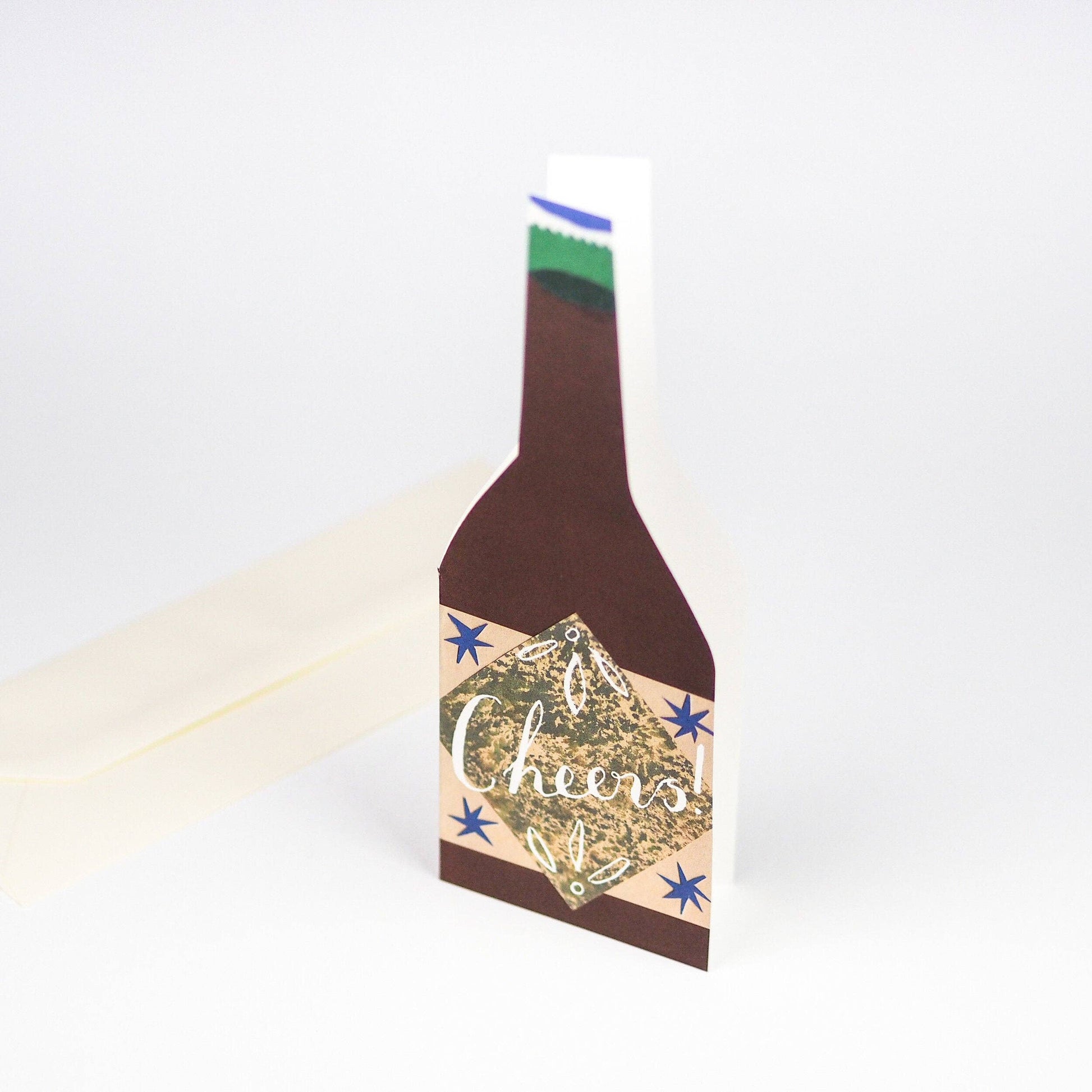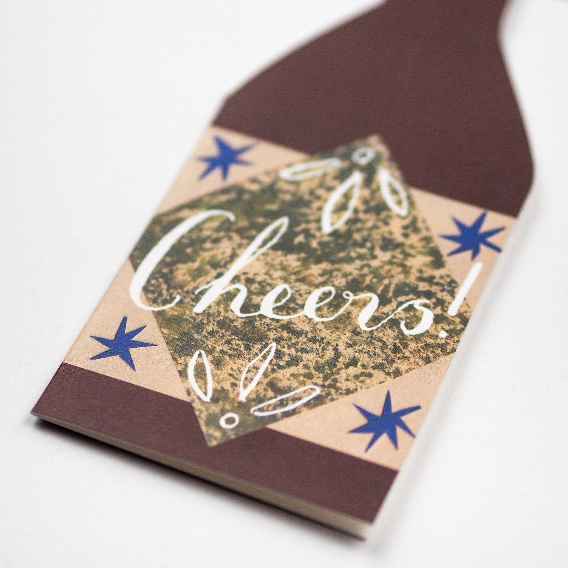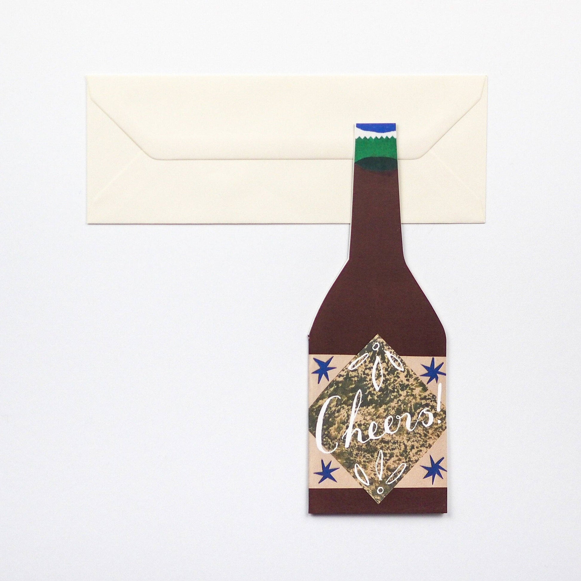 Cheers! A good multi-purpose toast for all sorts of occasions. A great way to say thanks and a cracking way to toast someones birthday too. This card is bottle shaped. Printed on high quality 300gsm card. Each card measures 7.5 cm by 21cm when folded and comes in a handsome ivory coloured envelope, the inside is left blank for your own message.