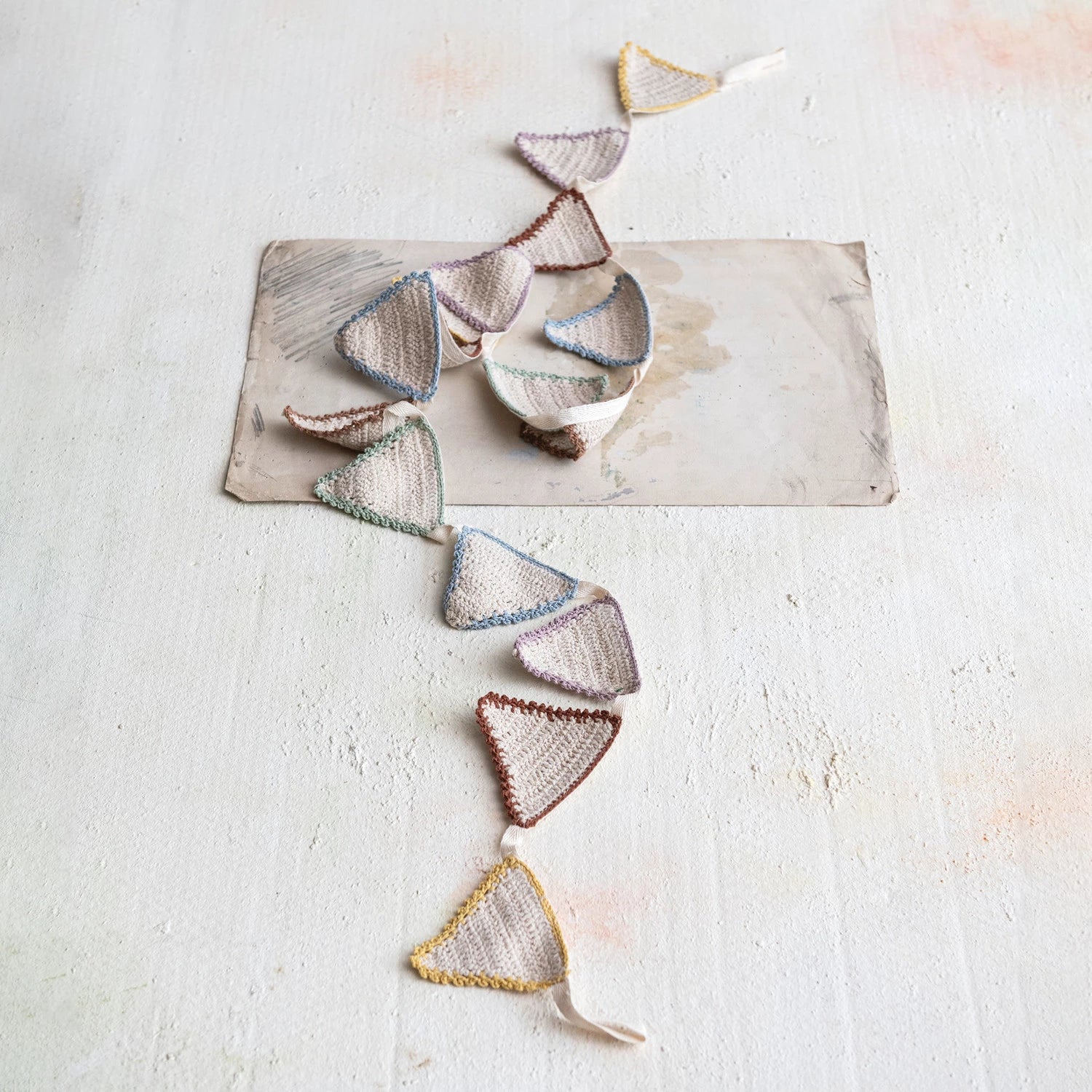 The hand-woven cotton crocheted pennant garland in a vibrant multicolor design is an ideal decorative piece to add a touch of whimsy and charm to any space. Made from high-quality, soft cotton, this garland measures 72 inches long, providing ample length for versatile styling options. Each pennant on the garland is meticulously hand-woven and crocheted, showcasing the artisanal craftsmanship that goes into its creation. The multicolor palette adds a playful and festive atmosphere, making it perfect for casual gatherings or parties. Whether it's strung across a mantel, draped along a wall, or hung in a child's room, this garland effortlessly elevates any area with its bohemian chic aesthetic. Furthermore, being made from natural materials contributes to sustainability and showcases ethical production practices—making it an excellent choice for conscientious consumers seeking both style and substance in their decor purchases.
