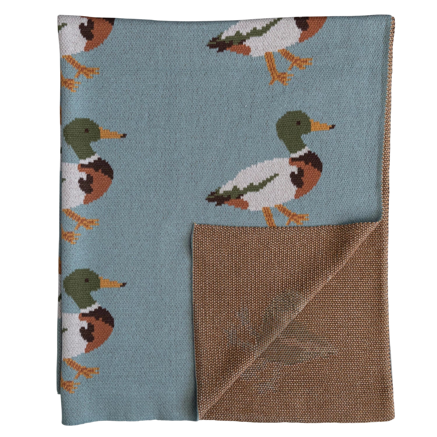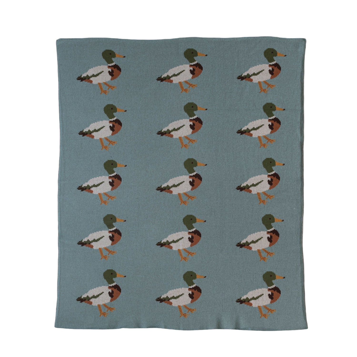 Make the baby's room more adorable with this cotton knit baby blanket with ducks in multicolor. This baby blanket features a woven duck print on soft knitted cotton, creating a whimsical and cheerful look. The colorful design adds some brightness and variety to the blanket. This baby blanket is suitable for displaying any style in a children's room, from classic to modern. Use it to decorate the crib, the rocking chair, or the wall. It is made from cotton, a natural and breathable material that is gentle on the baby's skin.
