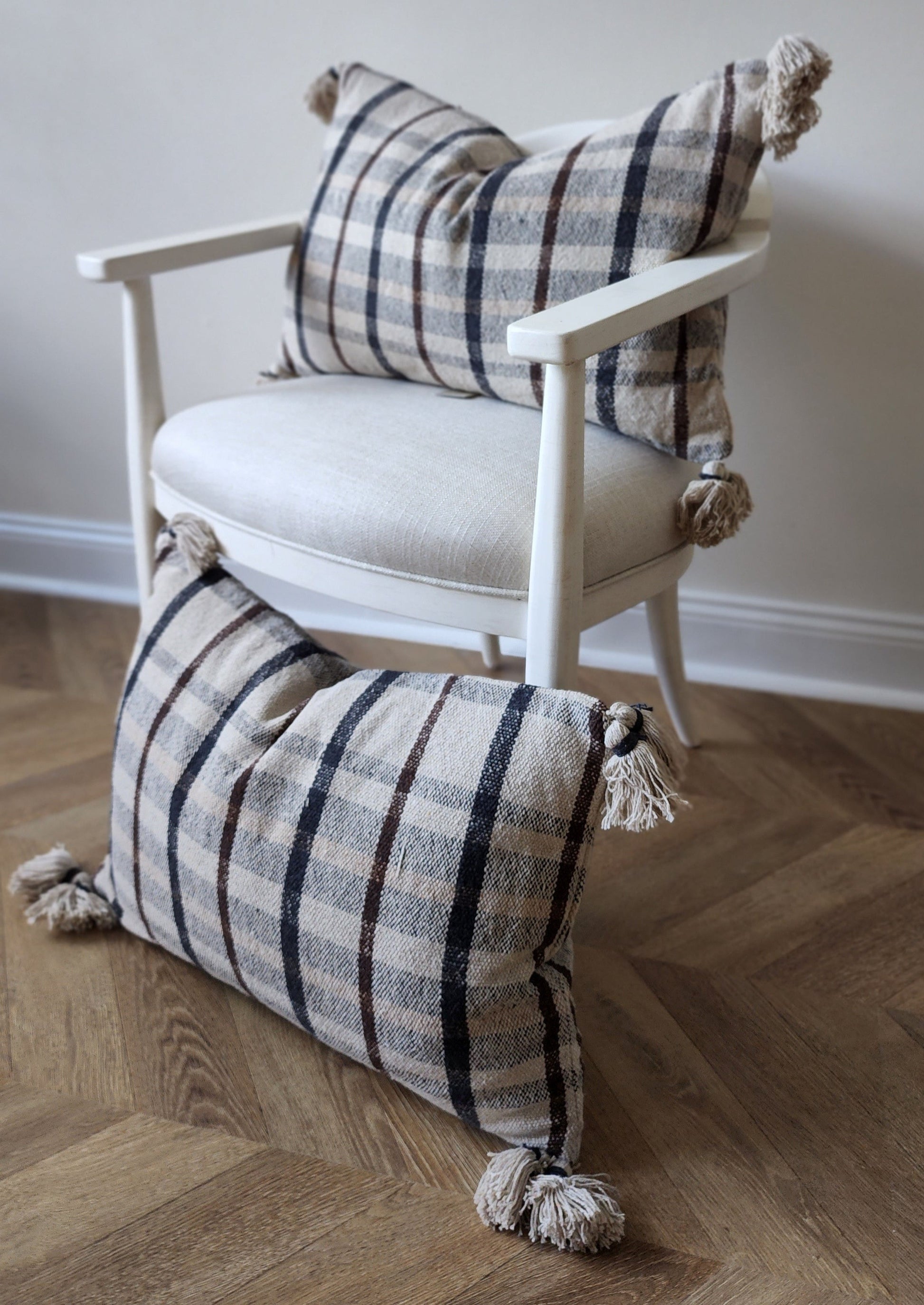 This cozy pillow has a modern checkered pattern with cocoa brown and deep navy on a light beige base. Large and cozy, this is a perfect throw pillow for movie nights or reading in bed.
