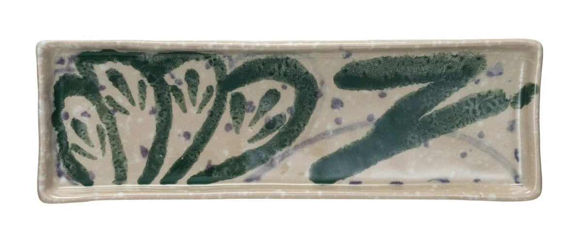 This green and cream hand-painted stoneware platter features an abstract design and a crackle glaze, adding depth and texture to the design. The reactive glaze not only enhances the visual appeal but also protects the hand-painted artwork. Made from robust stoneware, it can withstand frequent use while maintaining its beauty. The platter's ample size allows for a generous display of culinary delights, making it perfect for home or special events. Its aesthetic versatility makes it suitable for various decor themes, including coastal, farmhouse, beach, lodge, and abstract.