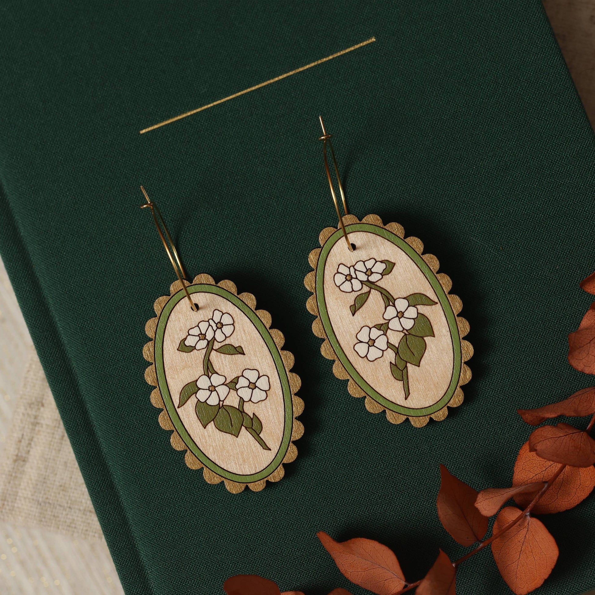 Introducing our "Vintage Lace" Collection – a nostalgic journey into the soft, feminine elegance of bygone eras. Each pair of earrings in this collection is a homage to the timeless beauty found in your grandmother's jewelry box, encapsulating grace and charm. These earrings were laser cut on sustainable Baltic Birch wood then hand-painted. All our jewelry is sealed with a glossy topcoat so they will last for years to come. Hoops are hypoallergenic, nickel-free 24k gold plated.