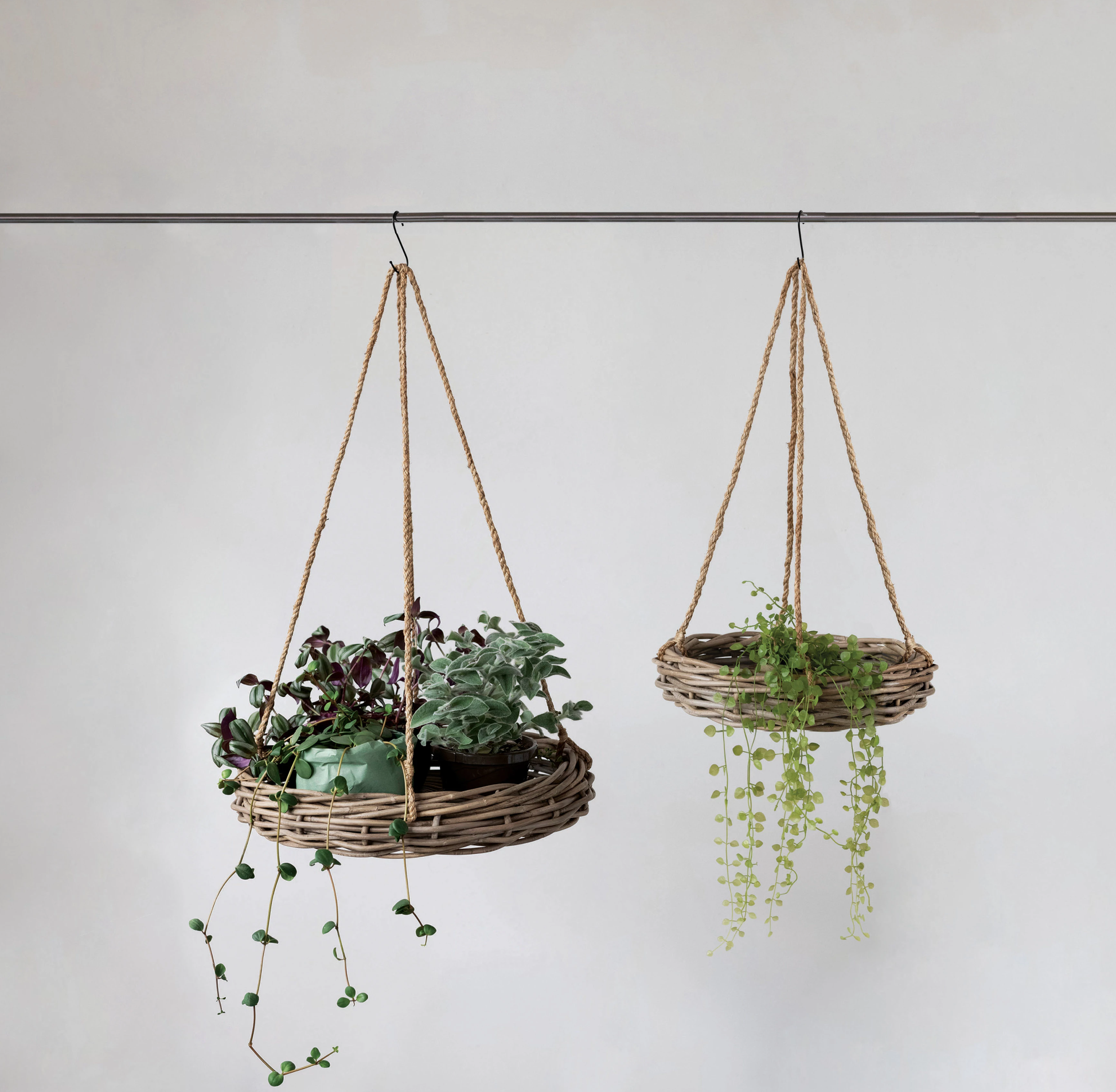 Beautiful oversized plant hanging baskets. Each basket fits several plants and allows them to hang beautifully in a window or corner. Rope hangers, all natural materials.