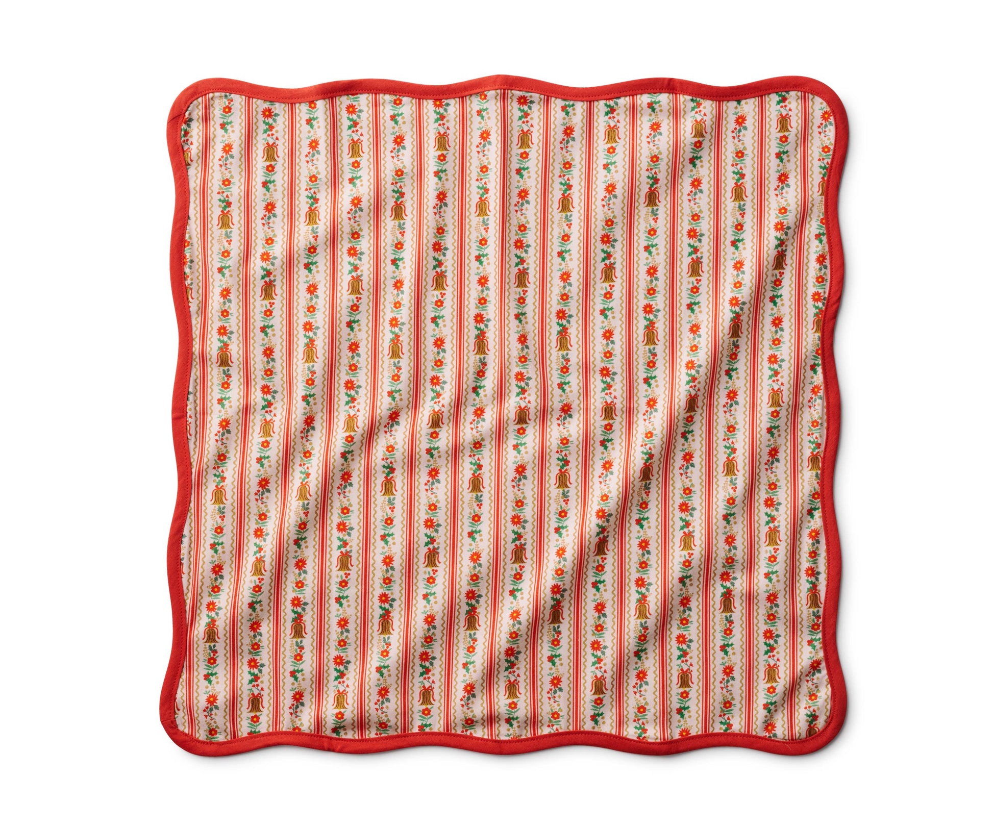Add something special to your holiday table with this set of four cotton napkins, featuring festive Holly Jolly illustrations and a contrasting scalloped edge.