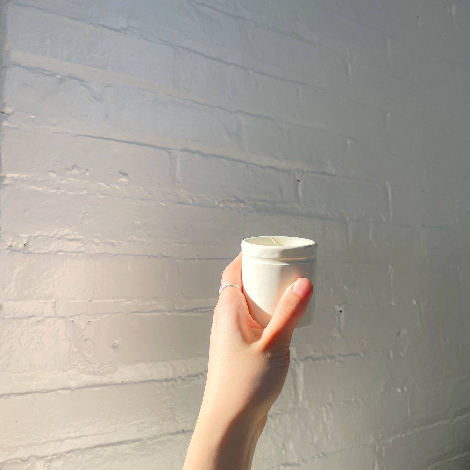 Our 4 ounce Jam Jar Candles in our Signature Studio Scent are soy wax candles poured into vintage French ironstone jars, scented with oils. Every jar is one of a kind and exhibits imperfections which are a part of the finished piece's charm. Each candle comes packed in a cotton muslin bag and burns for around 20 hours.