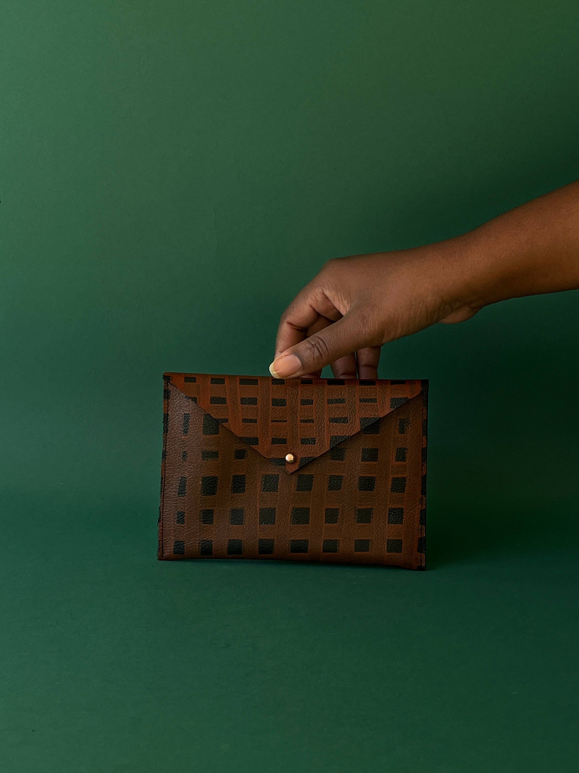 The Leather Carryall Pouch features an interior pocket for your cards and enough space for all the keepsakes you prefer to not have lost in the abyss of your bag. The minimal brass stud closure allows the bold pattern to shine while keeping all of your treasures secure.