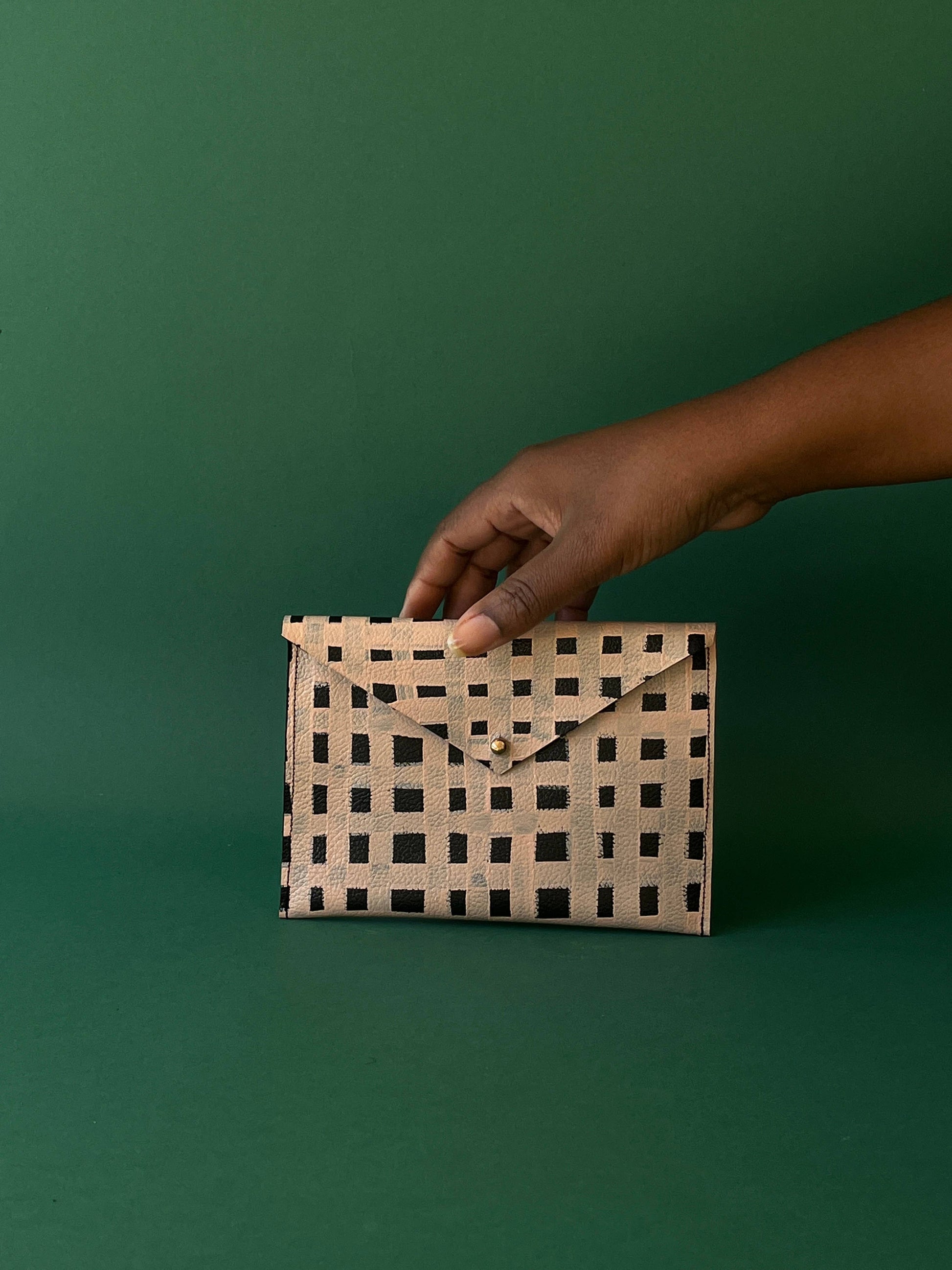 The Leather Carryall Pouch features an interior pocket for your cards and enough space for all the keepsakes you prefer to not have lost in the abyss of your bag. The minimal brass stud closure allows the bold pattern to shine while keeping all of your treasures secure.