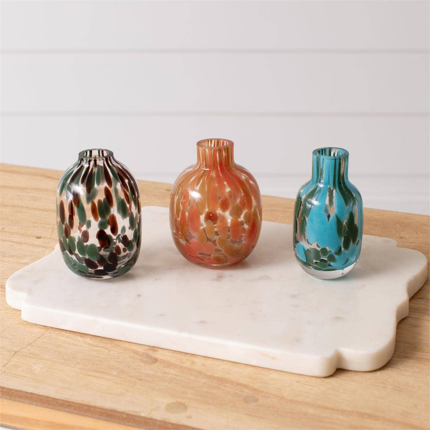 Add a playful pop of color and artisan charm to your decor with this set of mini speckled glass vases. Featuring three unique colorways and organic speckled patterns, each vase offers a handblown look that’s perfect for single stems, tiny bouquets, or simply as colorful accents on shelves, mantels, or tabletops. A beautiful way to add artistic flair in a compact form. Glass 3.75" H x 3 W, 3.75" H x 2.5" W, 3.5" H x 2" W.