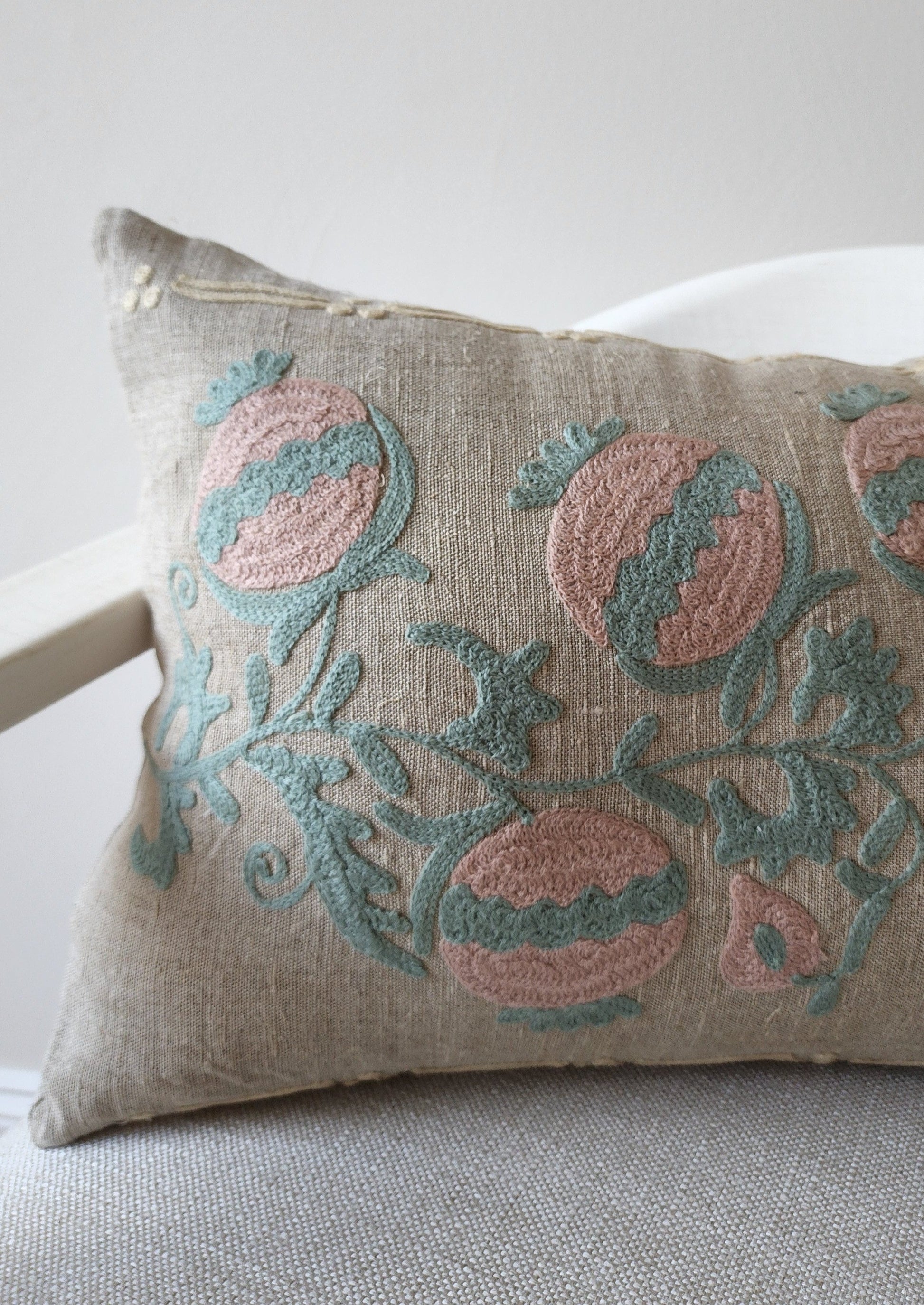 18th century inspired embroidered pillow with pale pinks and sea foam thread on a dark natural woven cotton base.