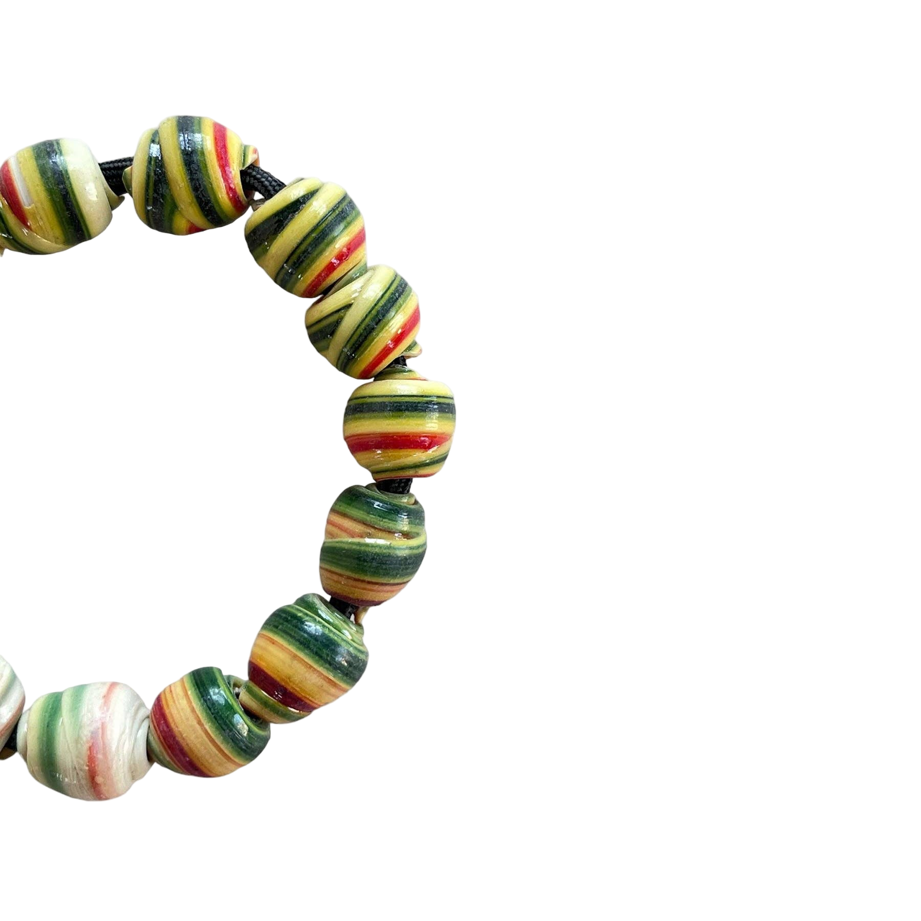 Resourcefulness is an important skill, and the Recycled Cassette Tape Bracelet Mixed is a prime example. Each bead creatively repurposes old cassette tapes. Made in Ghana, each bead varies in size, shape, and design.