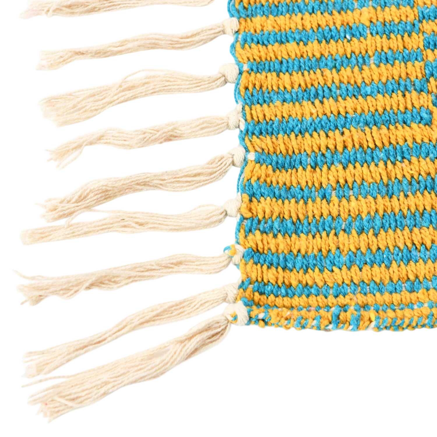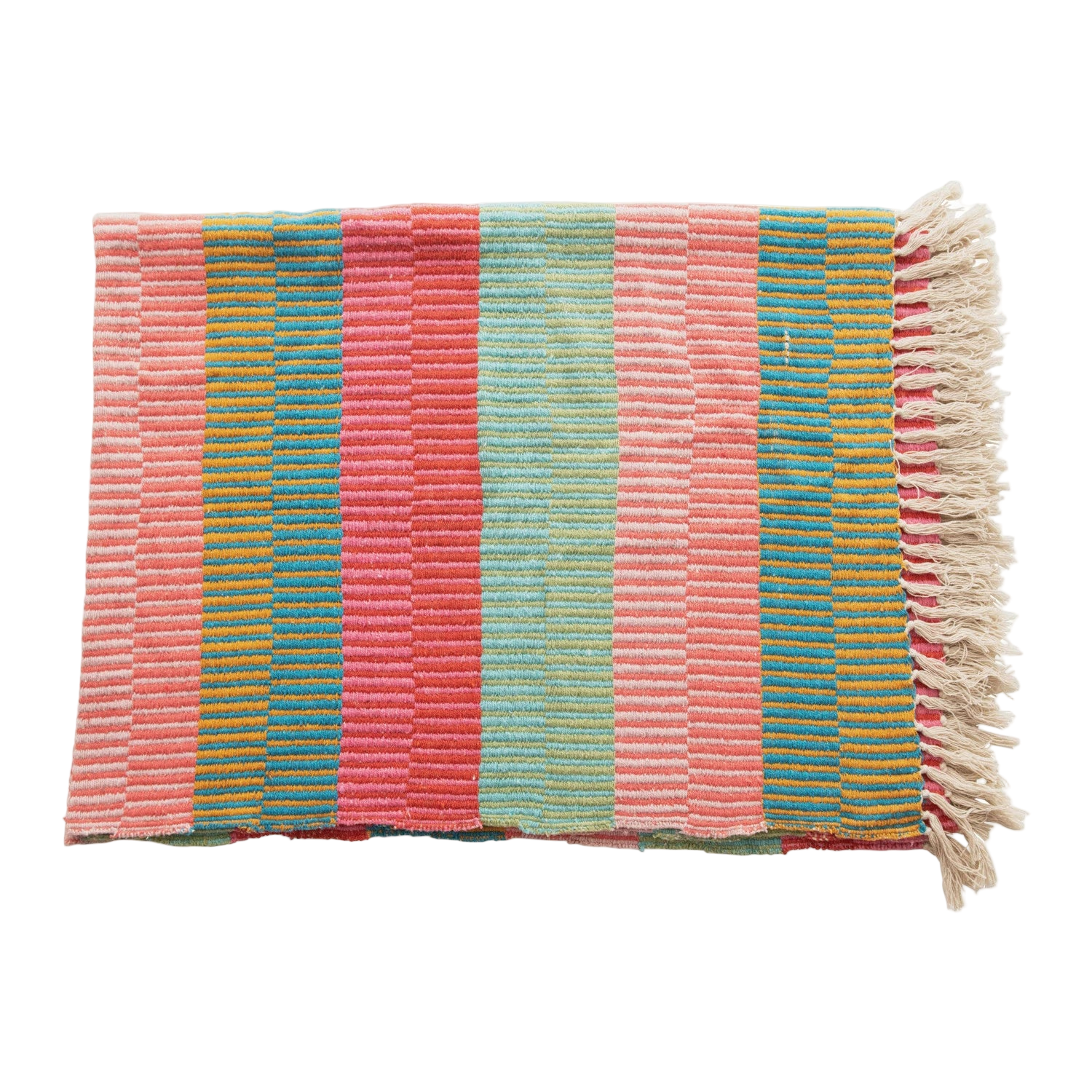 Add warmth and personality to the space with this woven reclaimed cotton blend throw with a cozy and colorful design. This throw is made of reclaimed cotton blend, an eco-friendly fabric that provides comfort and durability. The throw features a fun multi-colored stripe pattern that adds a touch of elegance and simplicity, while the fringe trim adds a touch of charm and personality to the throw. The throw is suitable for any space that needs texture and character, such as the living room, bedroom, office, or other area. It can also be an excellent gift for anyone who loves eclectic, bohemian, or global design. This throw is easy to care for. Simply machine wash cold, gentle cycle. Tumble dry low. Do not bleach, iron, or dry clean. Add this woven reclaimed cotton blend throw with stripes and fringe to the home and enjoy its beauty and functionality.