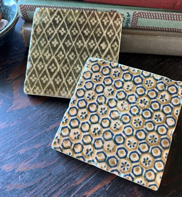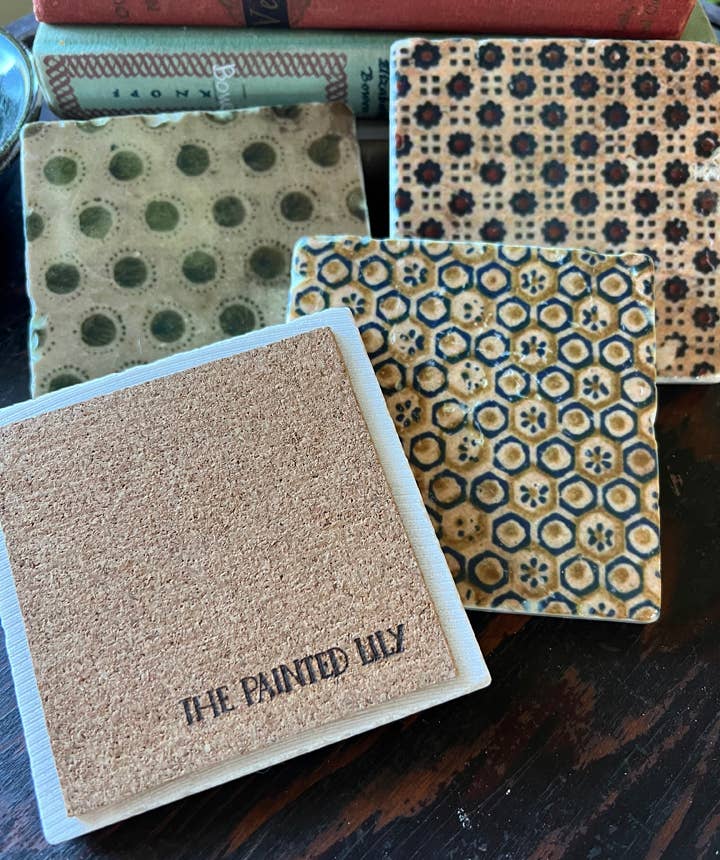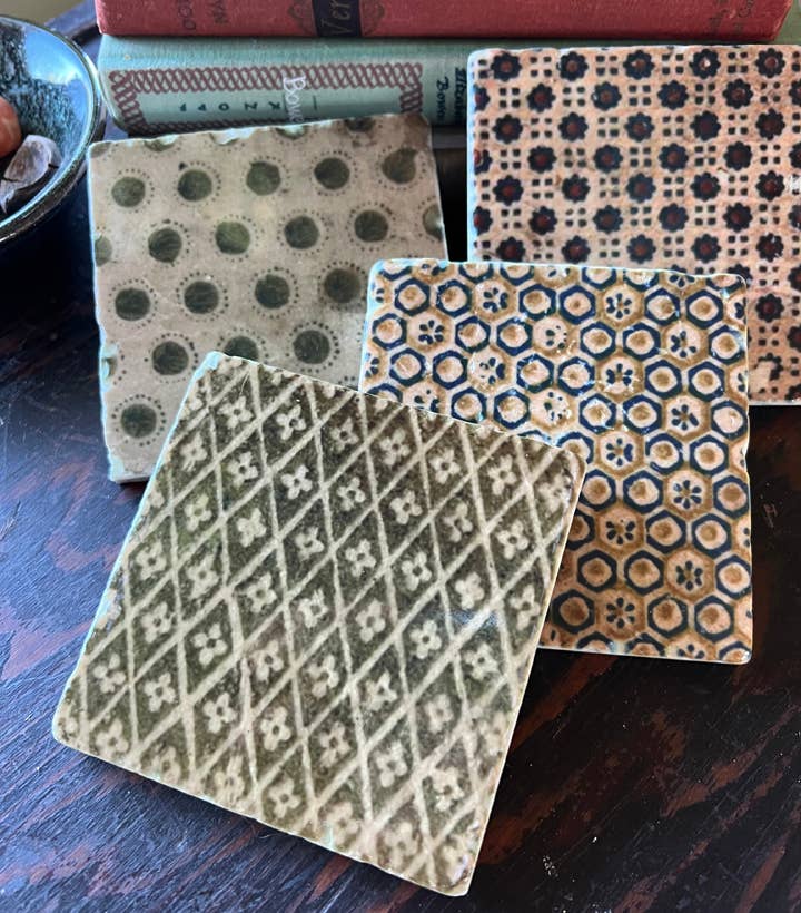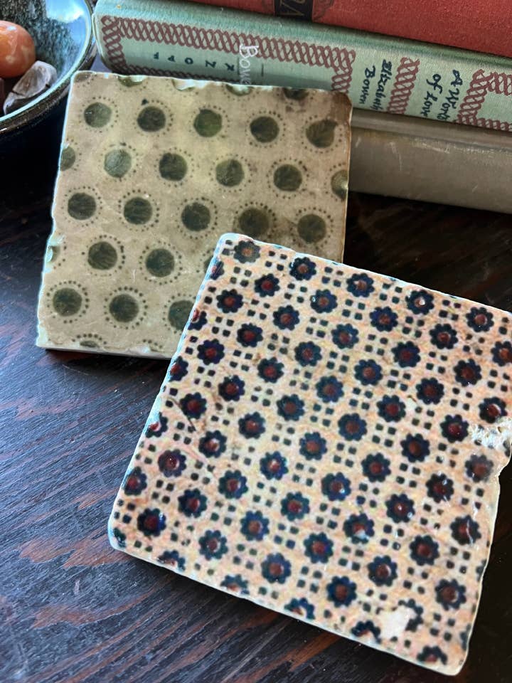 Our Sepia Antique Book Cover stone coasters are made using tumbled marble tile and beautiful, antique book cover patterns. Made to last a lifetime, our coasters are incredibly durable and good for use with hot and cold beverages. Like tiny works of art, our pieces are useful and beautiful!
