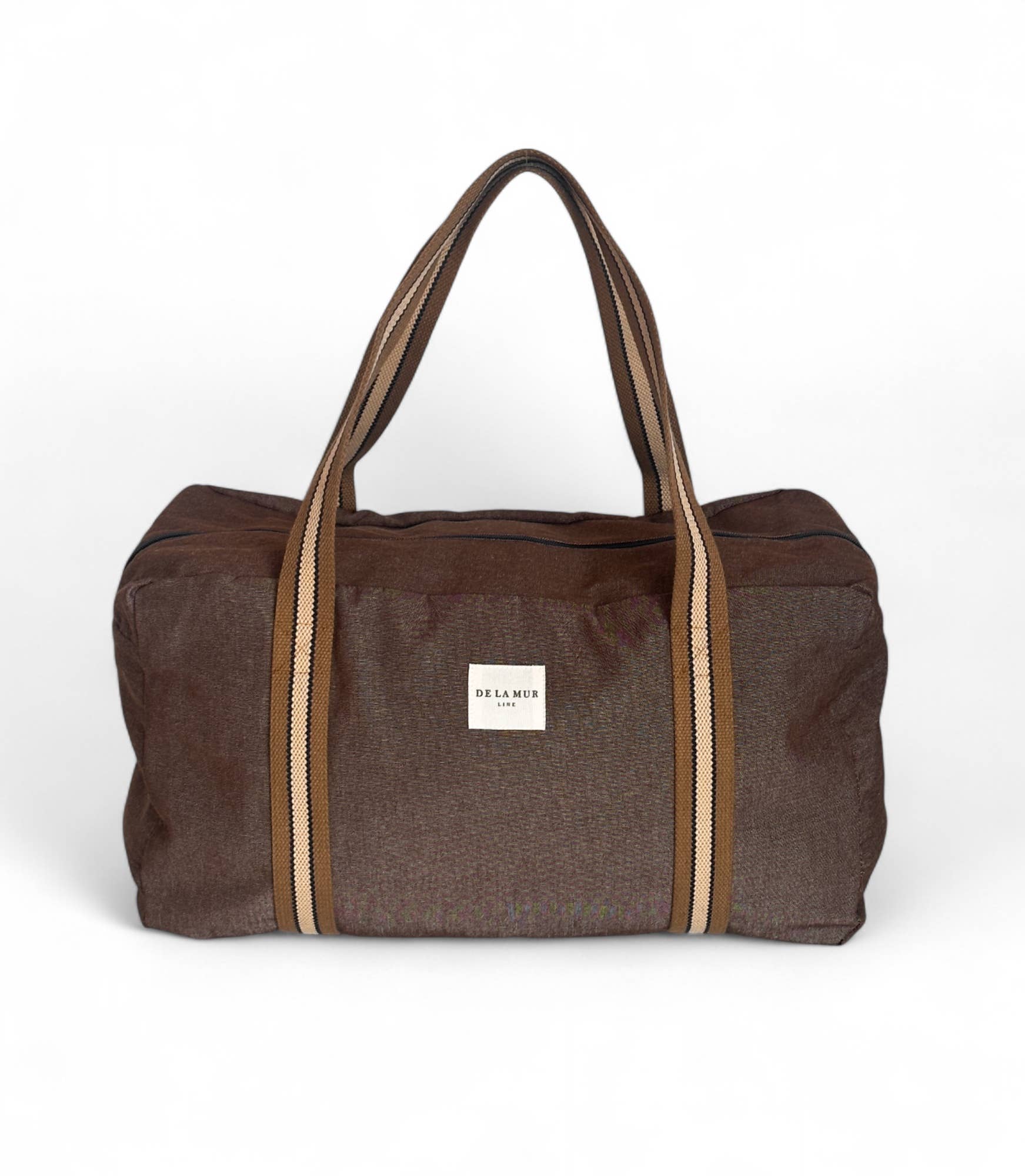 Sports bag with medium handles on top made of brown cotton tape with a central beige stripe. Made of thick plain brown fabric. Top zipper closure in gray. Interior zippered pocket. Lined with thick gray fabric on the inside. For proper care, hand wash in cold water and do not use a dryer.
