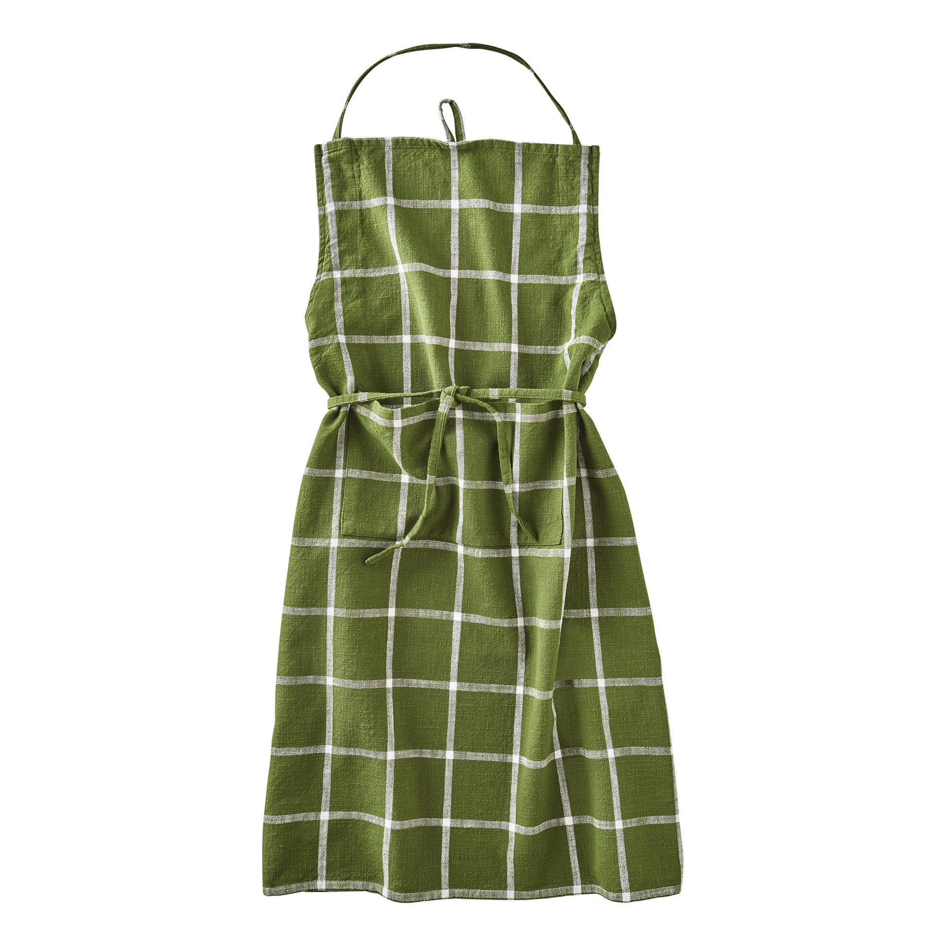 Protect your clothes from kitchen messes. Adding both function and style to typical kitchen tasks, this apron is made with 100% cotton and has a large pocket perfect for storing kitchen essentials while you work. Features include a woven slub chambray weave in a checked pattern and adjustable slide-through ties. Pre-washed for extra softness. Machine wash cold separately, tumble dry low.