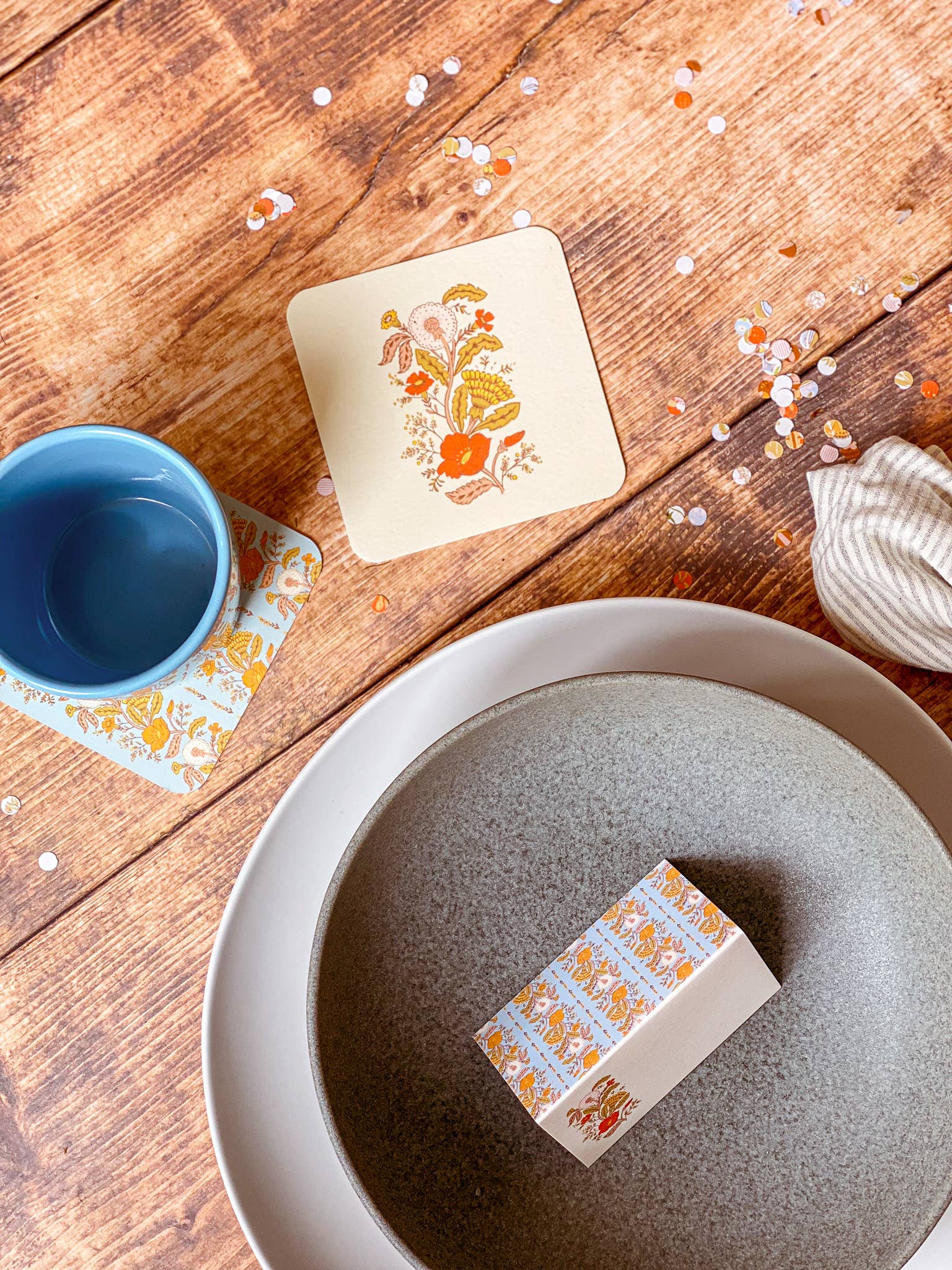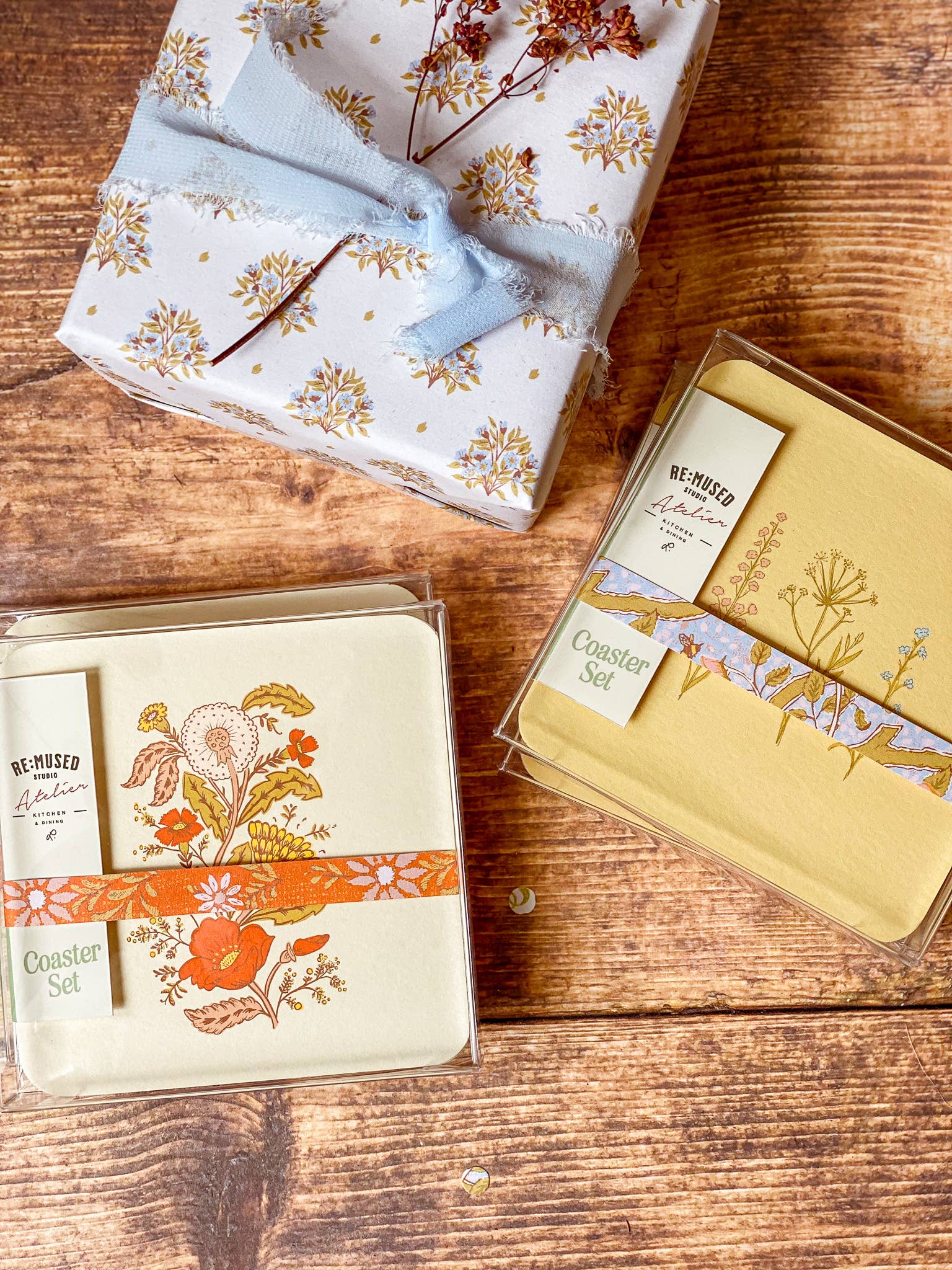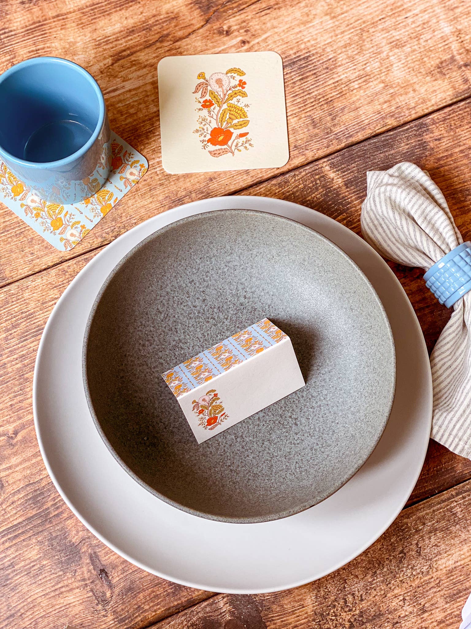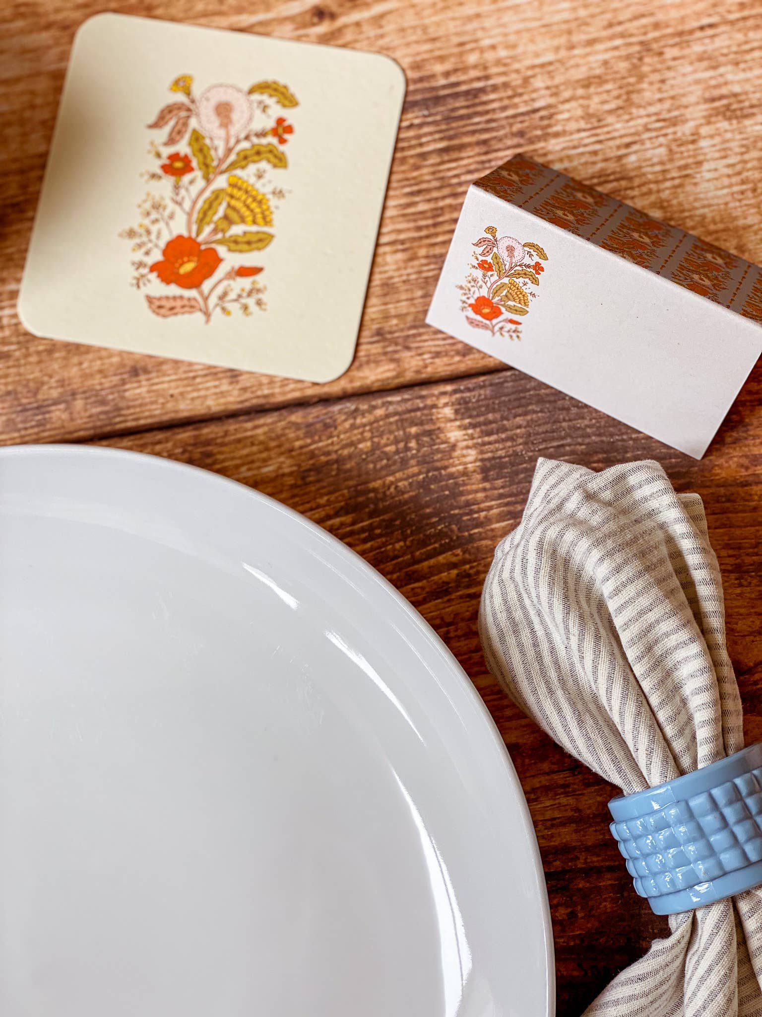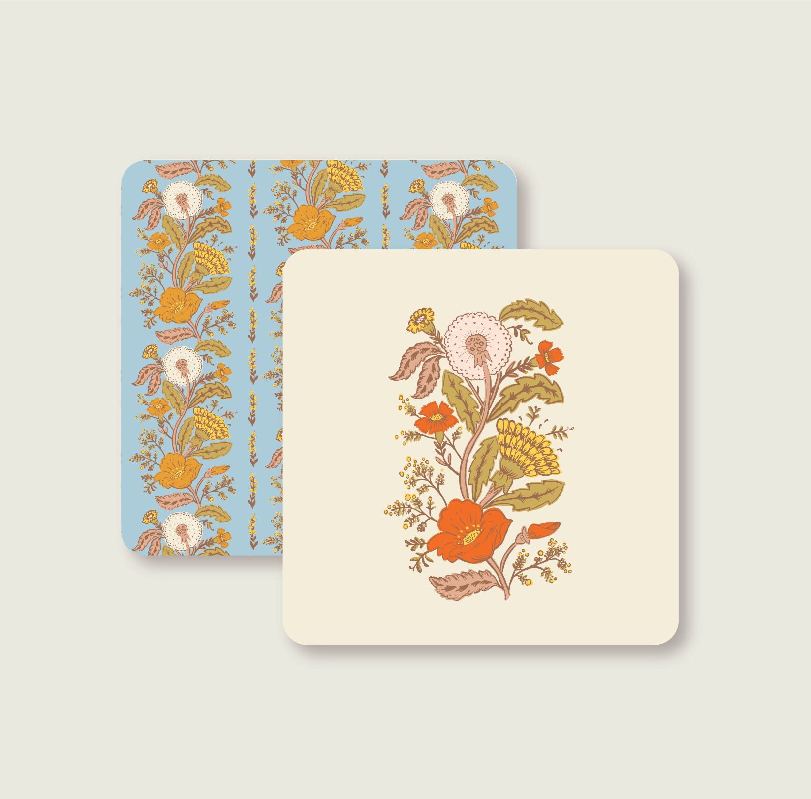 Our Wildflower Reverie double-sided coaster sets add a sophisticated vintage touch to your home entertaining. Warm up your table scape for Summer and Fall parties with these double thick paper coasters featuring a California poppy and dandelion motif on a cream background one side and blue striped pattern version on the other. Save table surfaces in style for celebrations, birthdays, baby and bridal showers, brunch or just elevate your every day dining. Coordinate with our matching table cards.