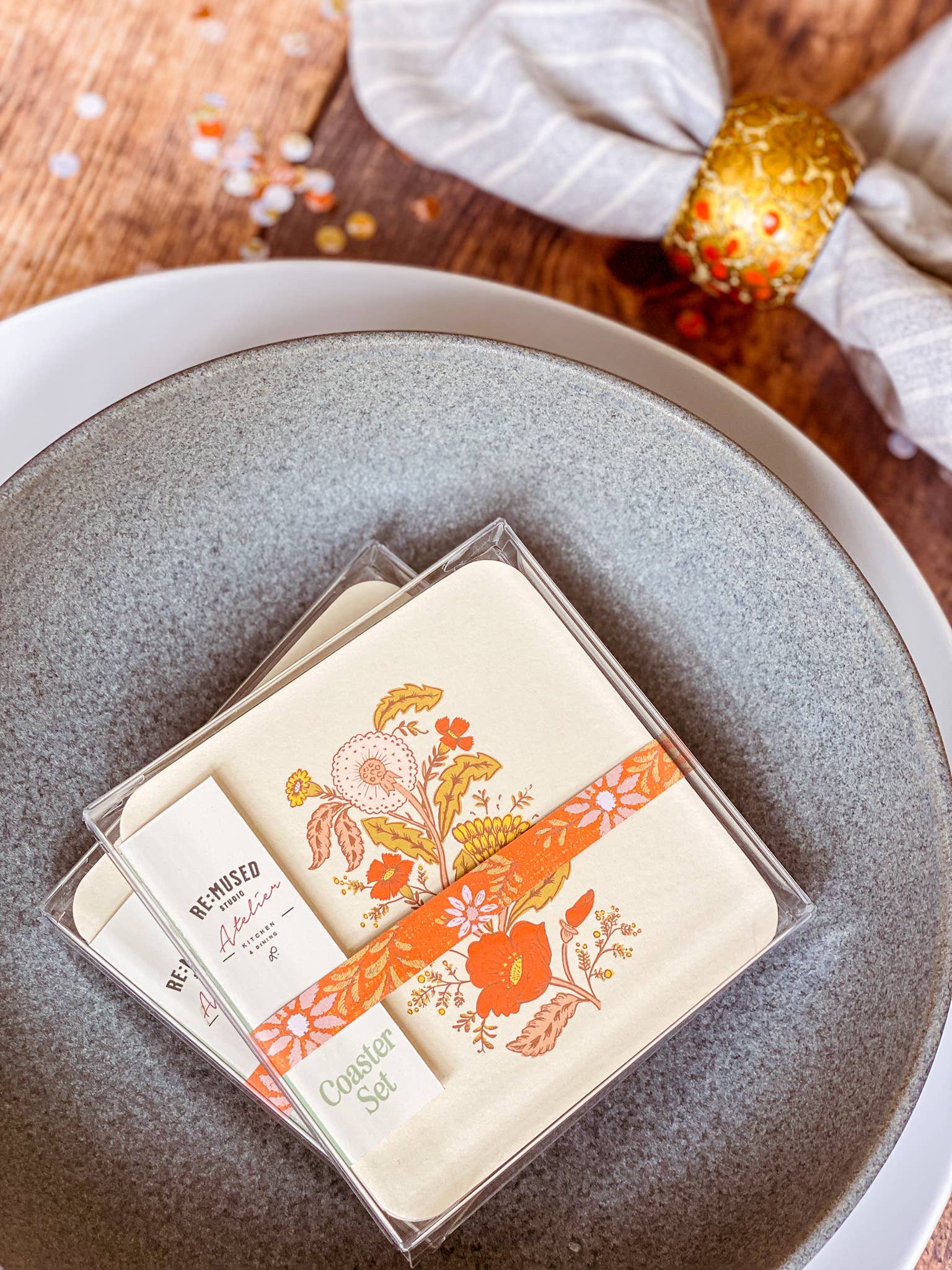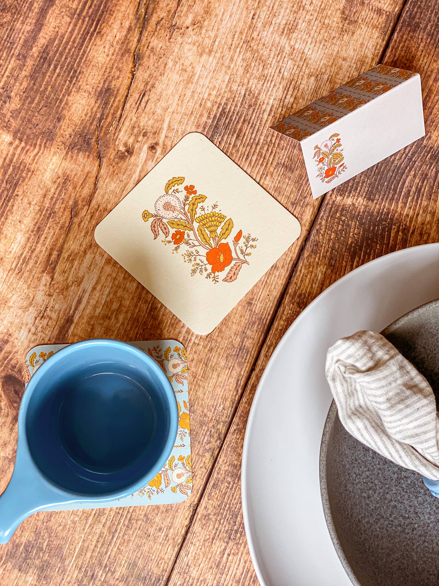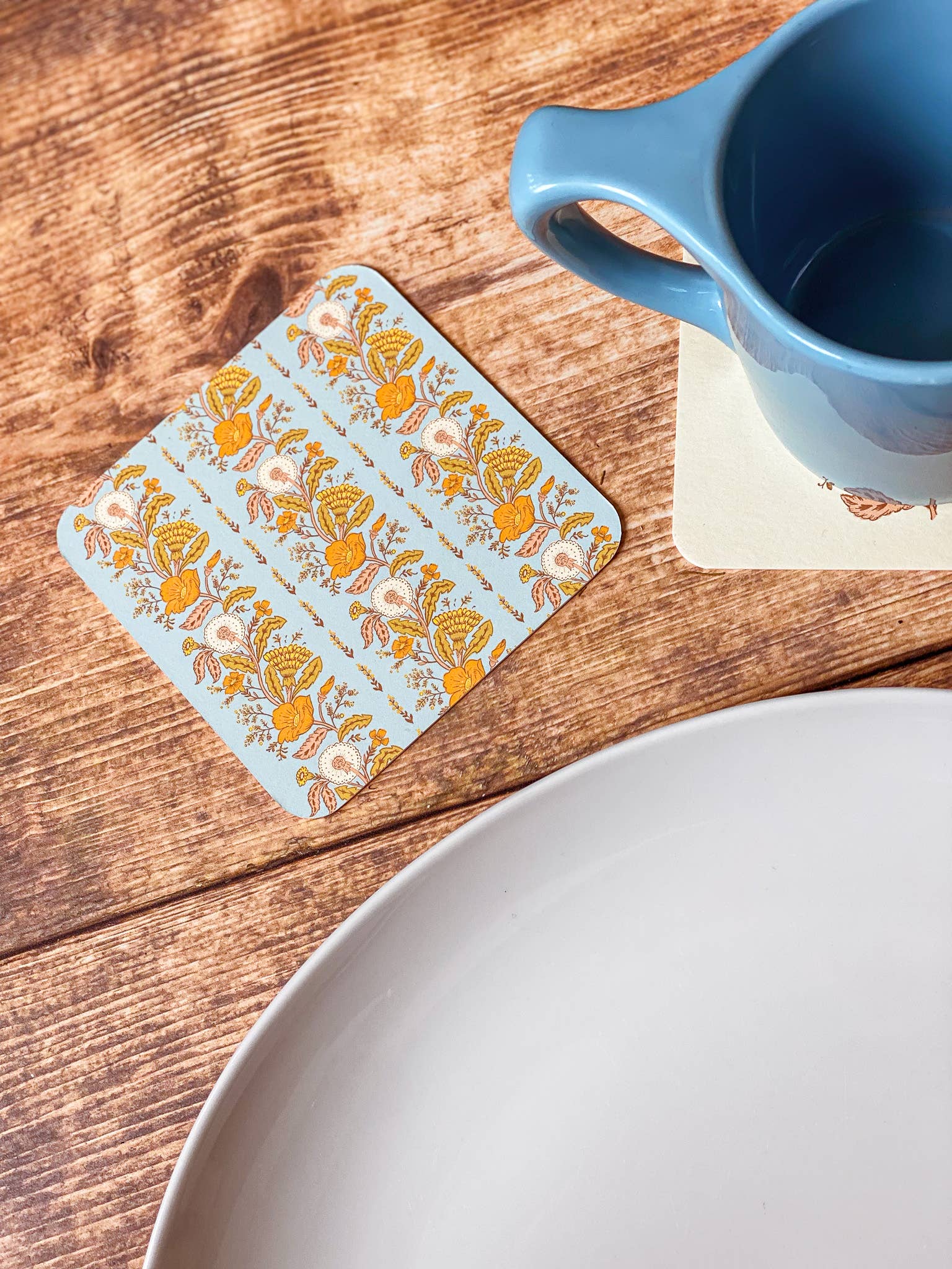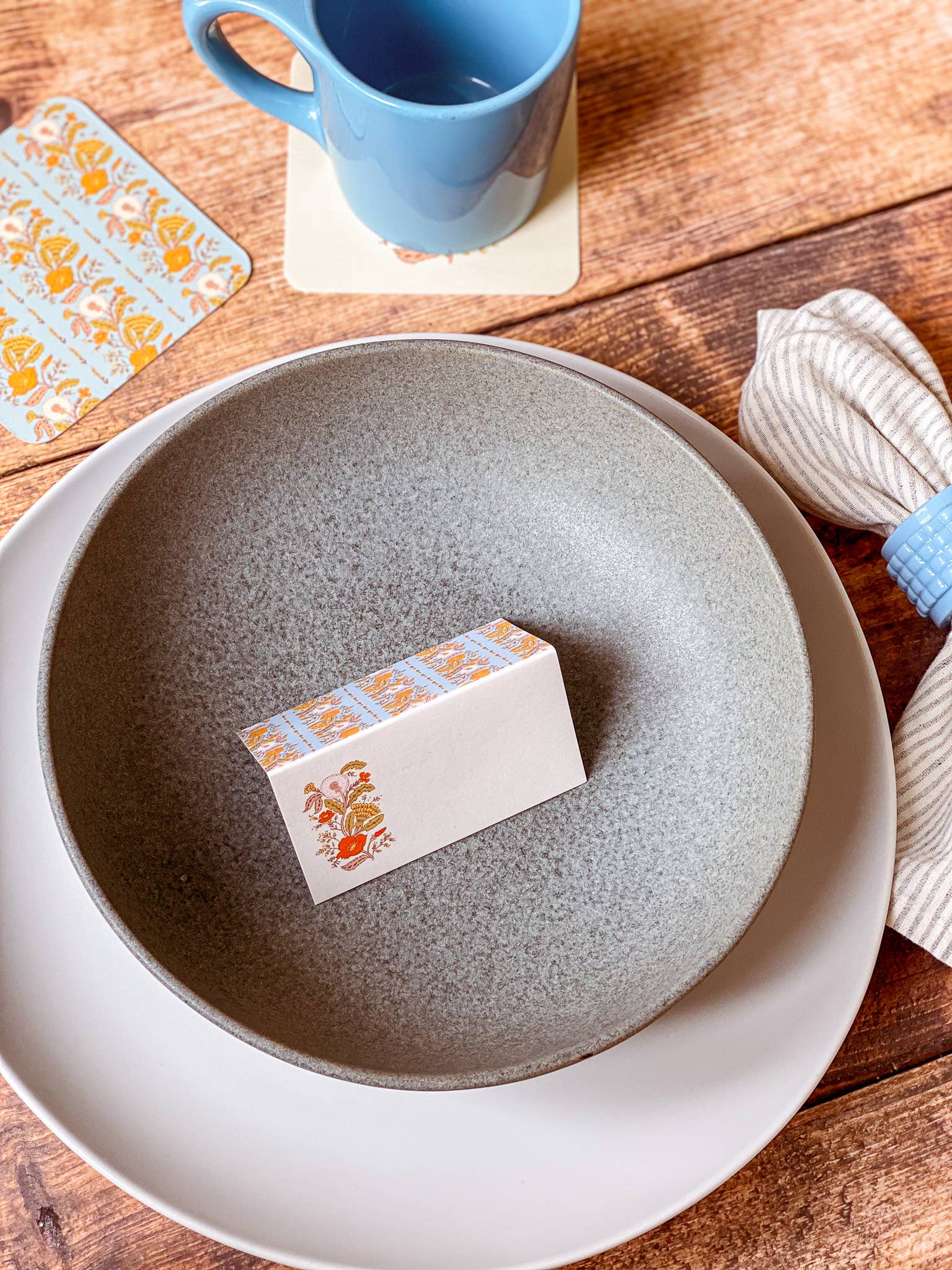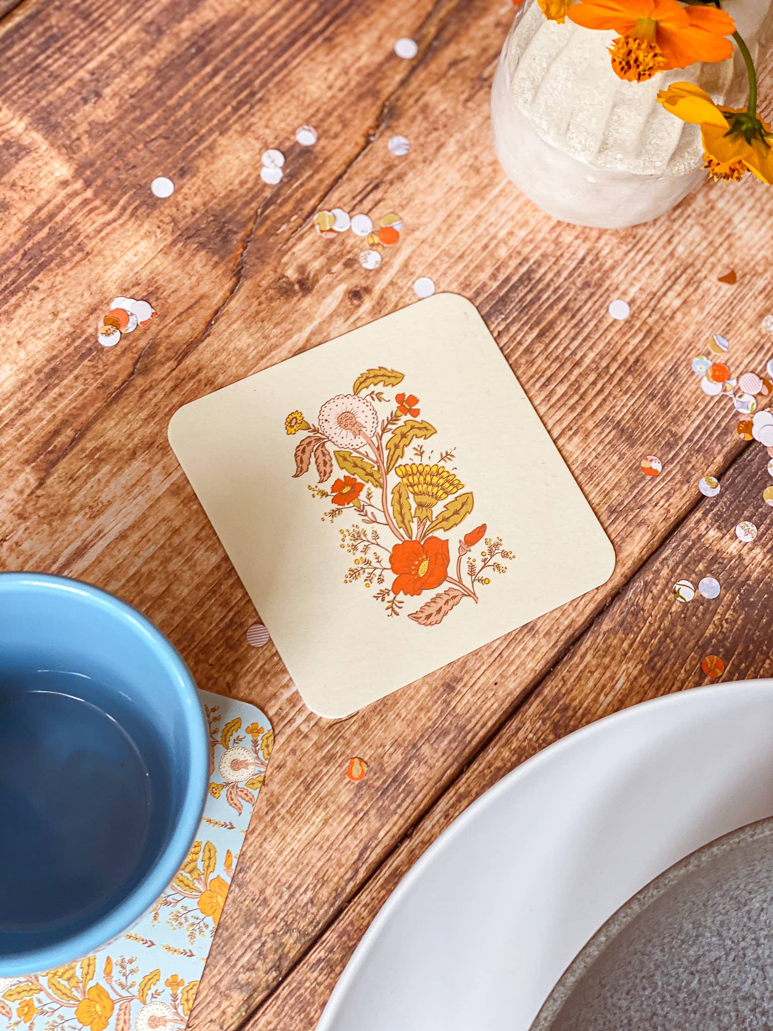 Our Wildflower Reverie double-sided coaster sets add a sophisticated vintage touch to your home entertaining. Warm up your table scape for Summer and Fall parties with these double thick paper coasters featuring a California poppy and dandelion motif on a cream background one side and blue striped pattern version on the other. Save table surfaces in style for celebrations, birthdays, baby and bridal showers, brunch or just elevate your every day dining. Coordinate with our matching table cards.