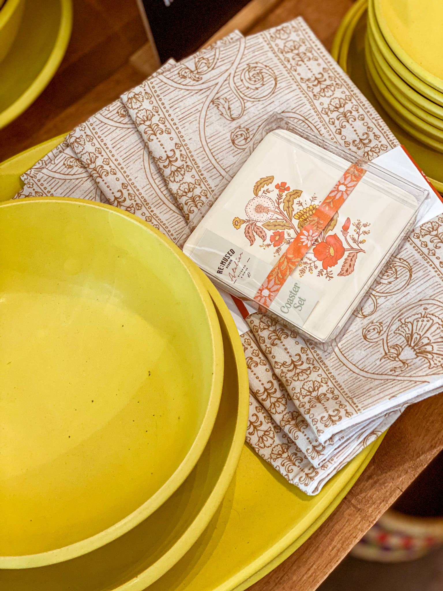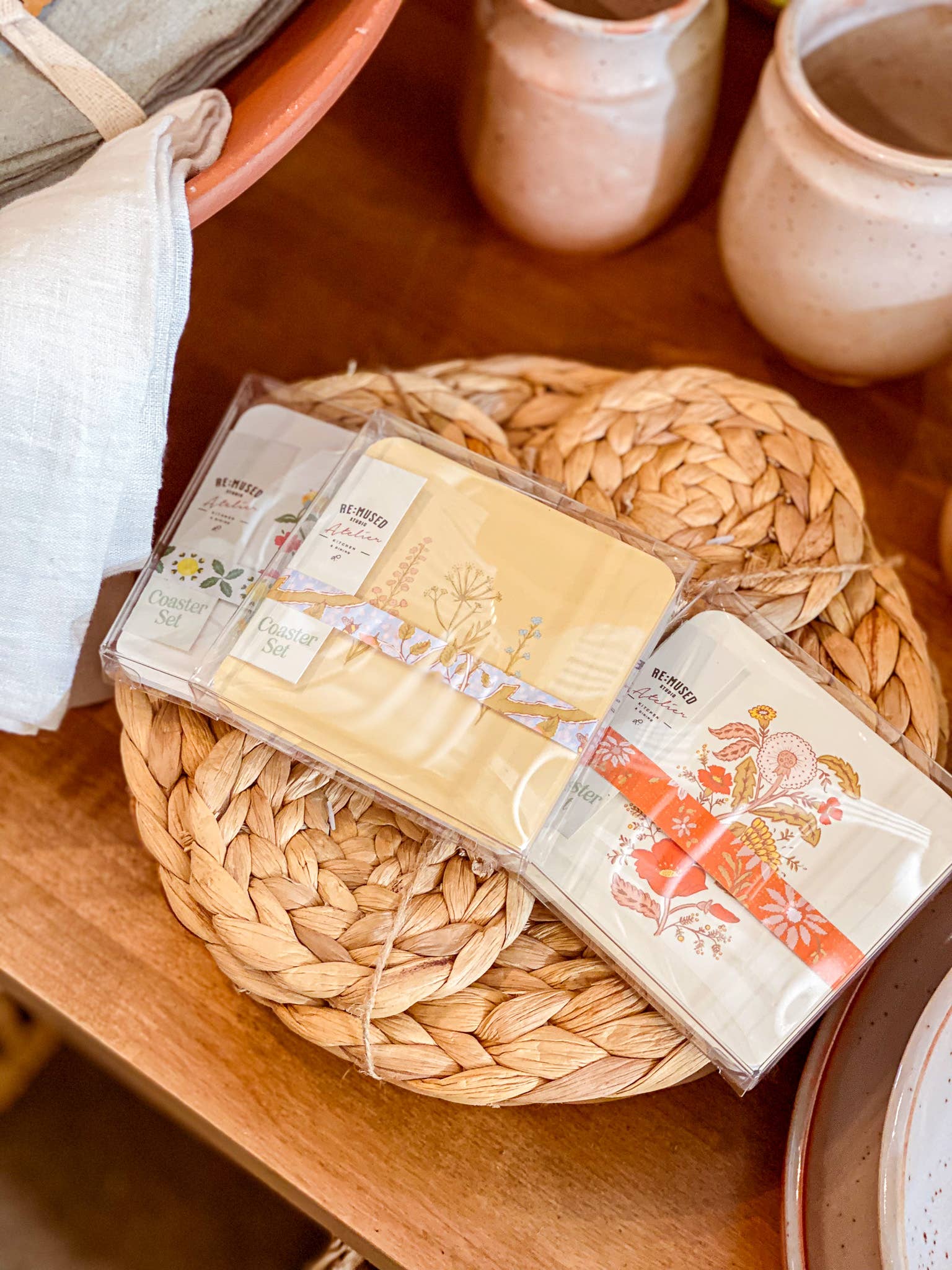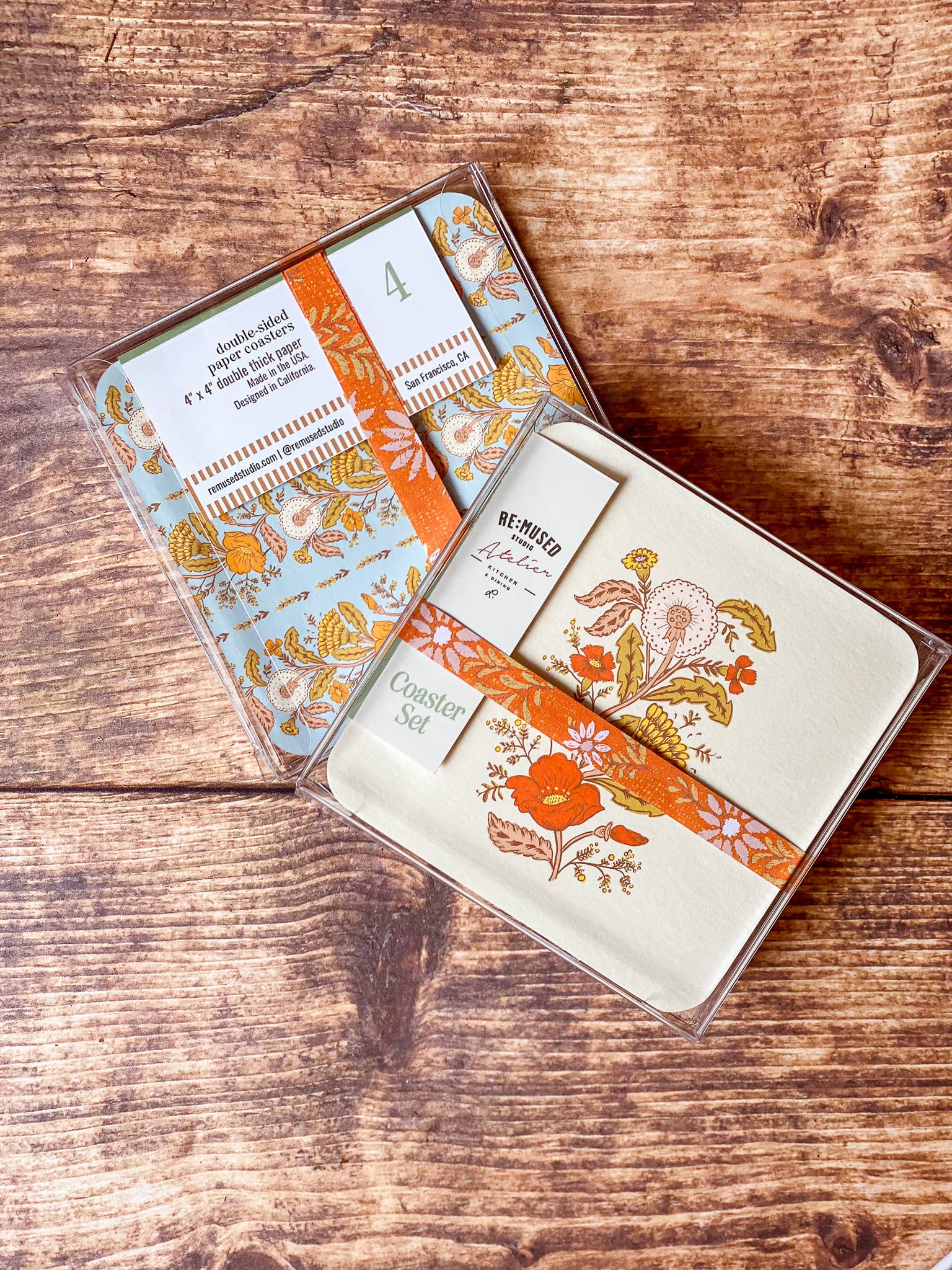 • Coasters come packaged with a paper paper wrapped label enclosed with a coordinating bellyband of our double-sided gift wrap and placed in a clear rPET box for easy display and protection.